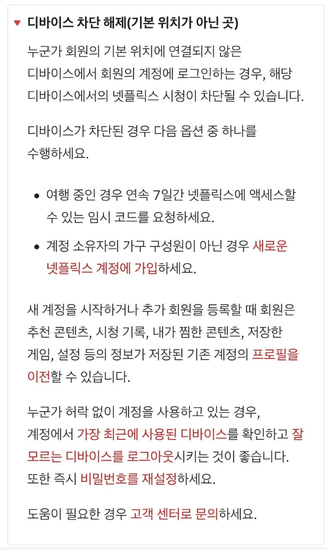 넷플릭스 계정을 사용하는 기본 위치가 아닌 곳에서 사용할 경우 차단이 될 수 있는데, 해당 인원이 가구내 구성원인지 아닌지 확인을 하기 위해서는 최소 31일에 한 번씩 기본 위치에서 넷플릭스를 시청한 이력이 있어야 합니다. 이 말은 계정 소유자가 메인으로 사용하는 와이파트 네트워크에 한 달에 1번씩 접속해서 넷플릭스를 시청해야 한다는 의미입니다. 그리고 장기 여행의 경우 임시 코드를 발급받아야 합니다.