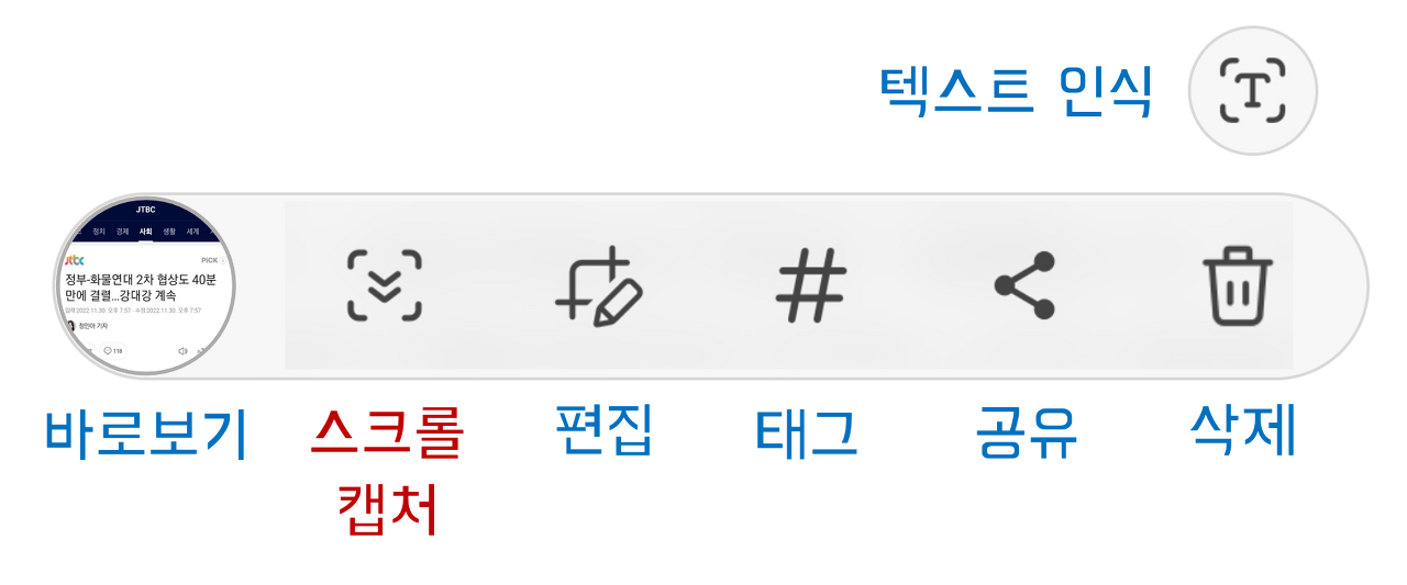화면을 캡쳐하고 마면 화면 아래에 화면캡쳐와 관련된 도구가 나타납니다. 1️⃣ 캡쳐한 화면 바로보기, 2️⃣ 이미지 편집, 3️⃣ 태그 추가, 4️⃣ 캡쳐한 이미지 공유, 5️⃣ 삭제, 6️⃣ 텍스트 인식 6가지의 도구가 나타납니다. 캡쳐한 화면 바로 보기의 경우 말 그대로 캡쳐한 이미지를 확인할 수 있는 메뉴이며, 이미지 편지의 경우 크롭하는 것처럼 이미지를 편집하는 경우에 사용합니다.