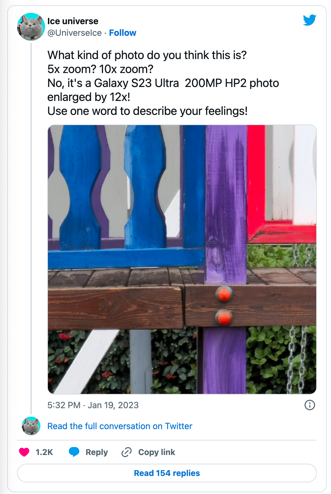 “What kind of photo do you think this is? 5x zoom? 10x zoom? No, it's a Galaxy S23 Ultra 200MP HP2 photo enlarged by 12x! Use one word to describe your feelings!”