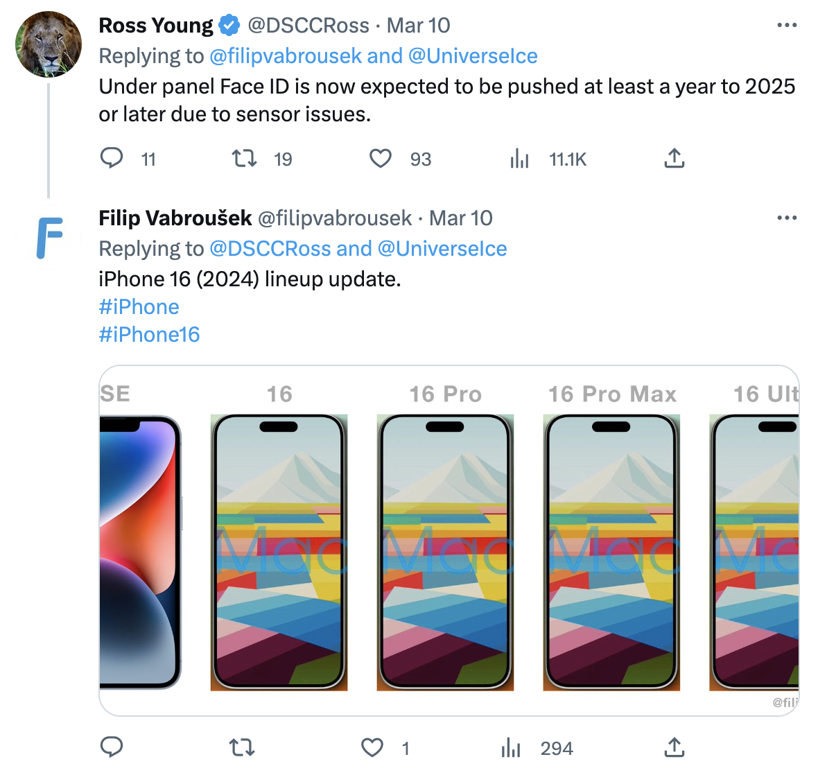 3월 9일 Ross Young의 새로운 트윗에 의하면 애플이 Face ID 카메라와 센서를 디스플레이 아래에 넣기 위해 노력을 하고 있지만 기술적인 완성도가 부족해서 아이폰 16에 적용되지 못할 것이라고 합니다. 최소 2025년 아이폰 17 시점은 되어야 언더 디스플레이 Facd ID 적용이 가능할  것으로 예측하고 있습니다.