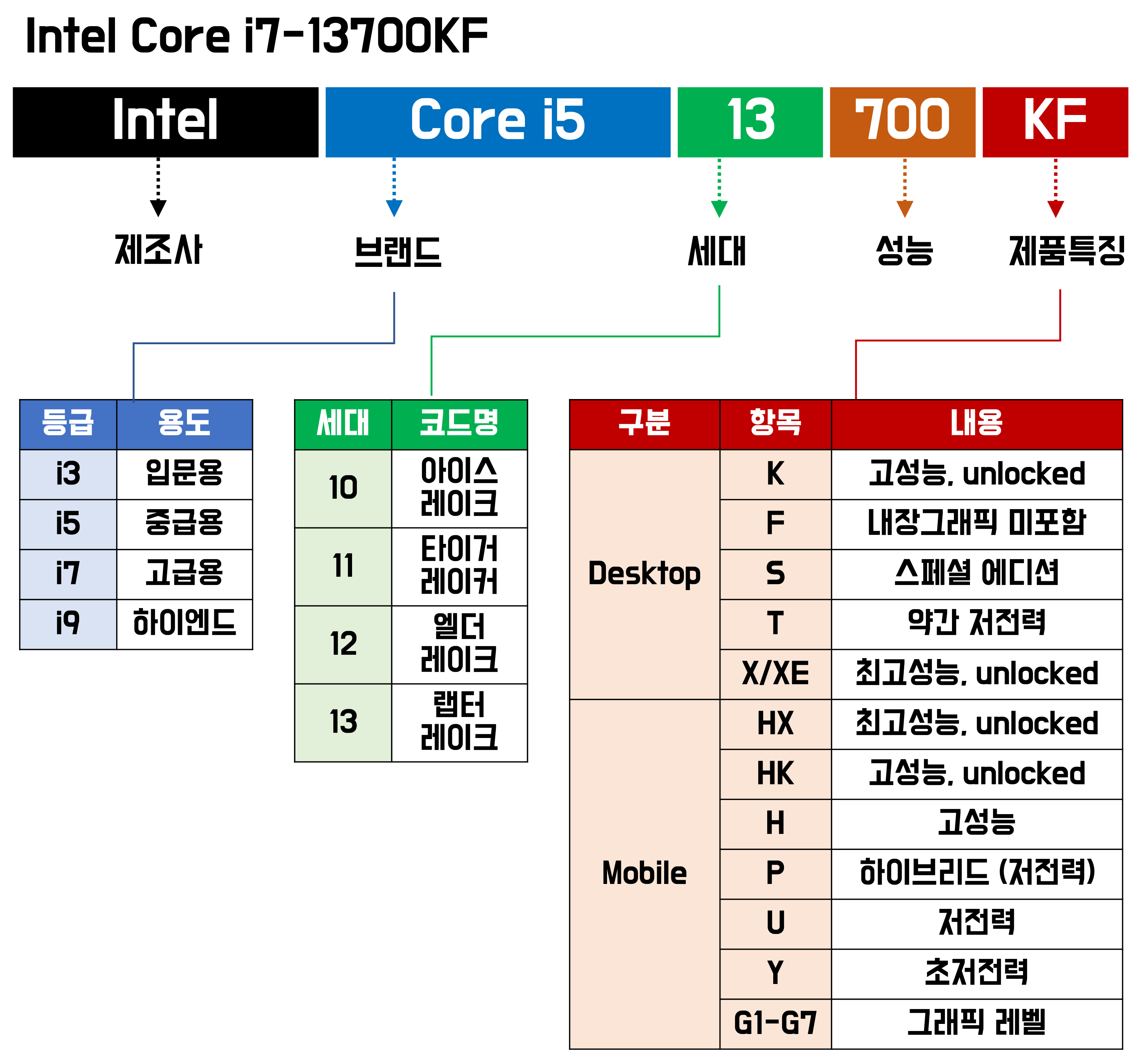 인텔 CPU의 모델명은 제품의 특징 (브랜드, 세대, 성능)을 모델에 넣어서 표현을 하고 있습니다. 모델명을 통해 대략적인 제품의 용도와 성능을 유추할 수 있습니다.  예를 들어 Intel Core i7-13700KF라른 CPU 이름을 보면 Intel은 제조사를 나타내고, Core i5는 CPU 브랜드 이름, 그리고 13700에서 13은 13세대라는 의미이고, 뒤에 3자리 700은 모델명이라고 생각하면 됩니다. 여기서 모델명은 숫자가 높을수록 성능이 좋다고 생가하시면 됩니다.